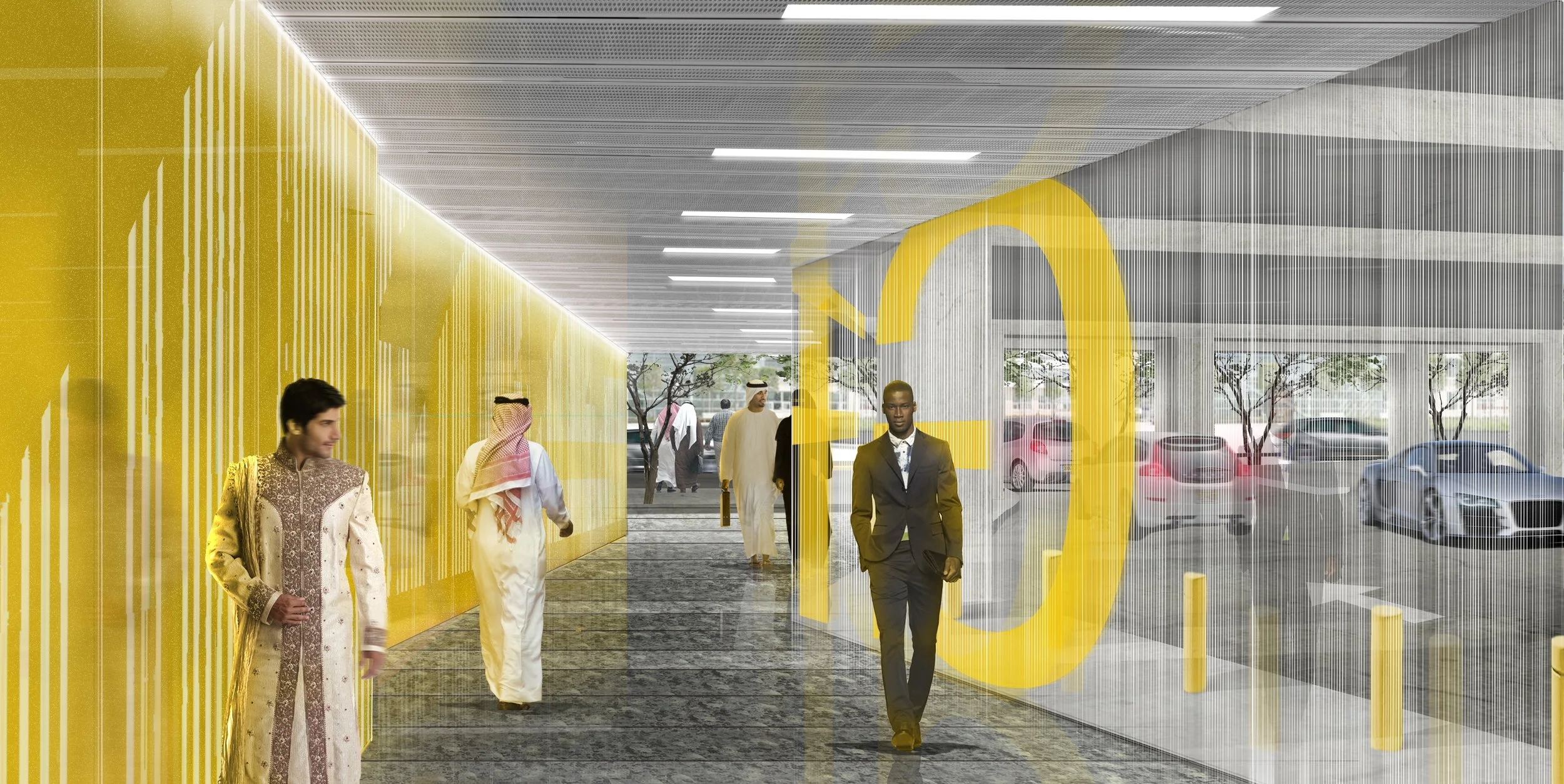 Sited in the outer rings of the new King Abdullah Financial District of Riyadh, the three SkyParks take on strong ‘background’ roles, forming a unified set of ‘front door’ arrival experiences for the district. Their facades, silhouettes, and rooftop gardens create activated, livable infrastructure of the city. Inside the car parks, lightwells allow the sun to penetrate through nine levels, four below grade, to enrich the experience while providing easy and natural wayfinding. On the rooftops, neighborhood parks are provided for play, active, and social spaces.